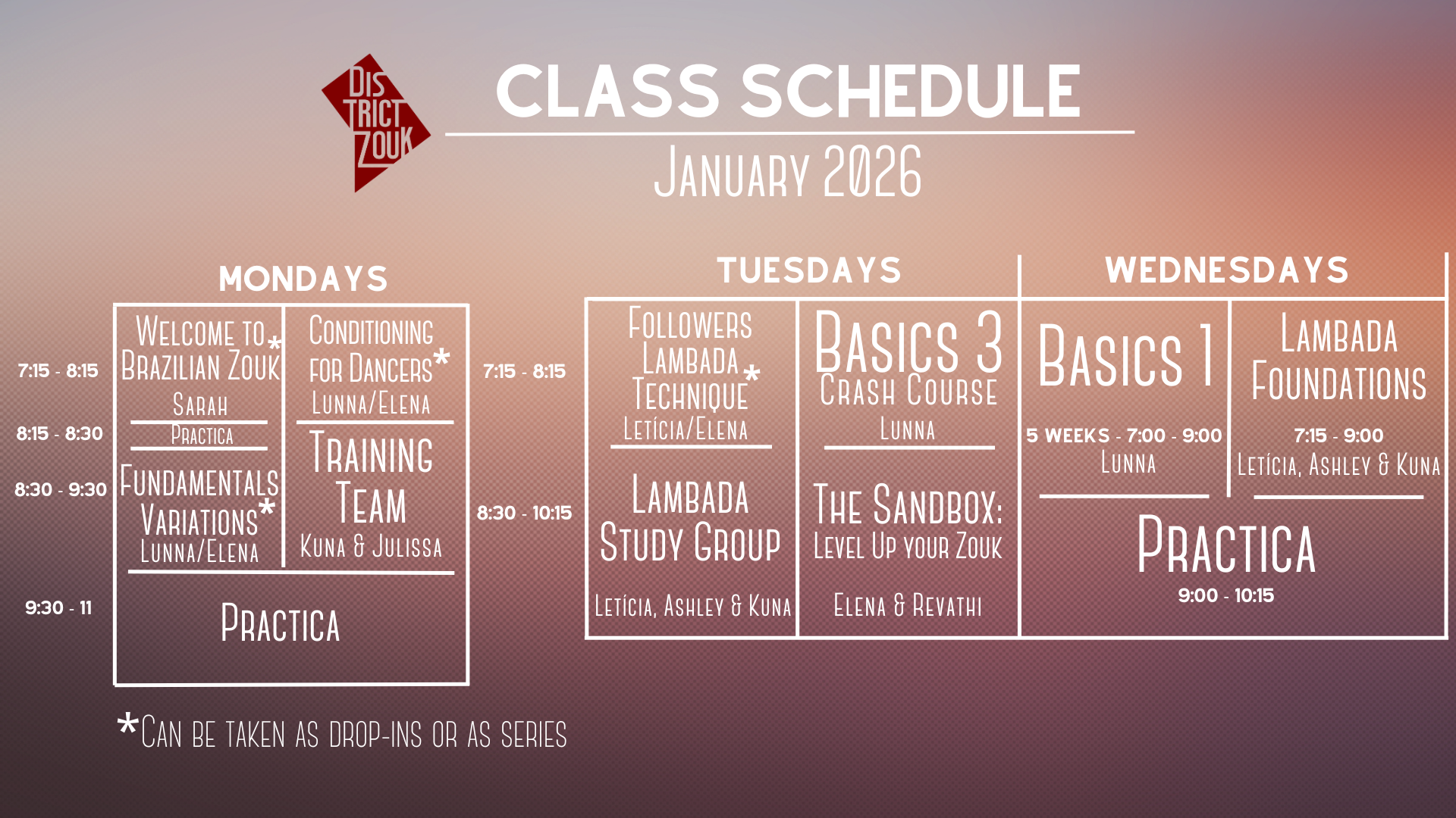 Our weekly Monday drop-in classes and practicas are a great way to start learning Brazilian Zouk, refresh the fundamentals, and get some practice time in.