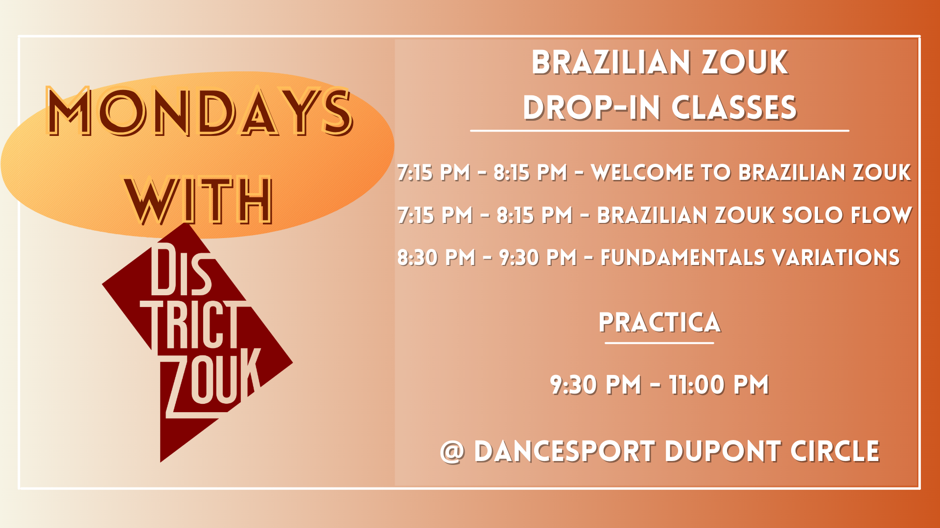 The teachers for the Monday classes rotate each week from our District Zouk team.
