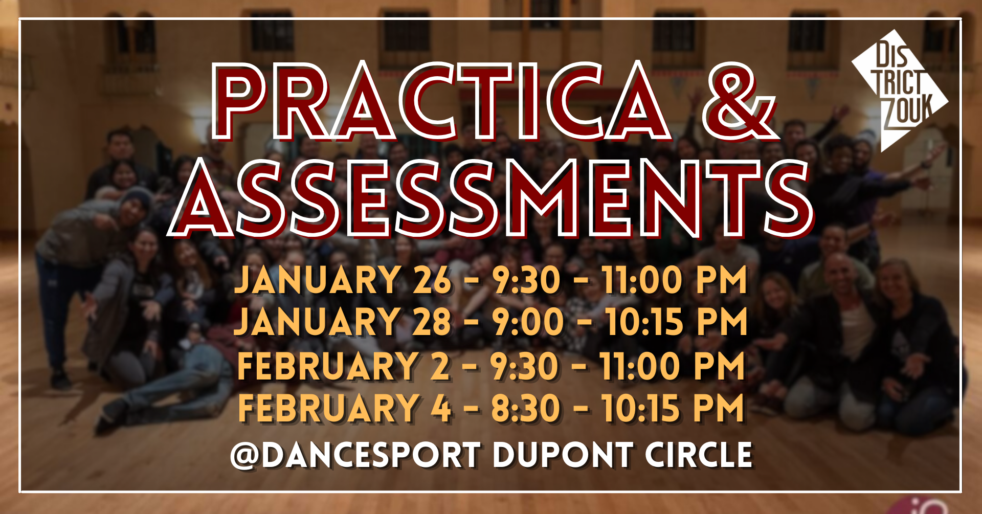 As we prepare for our next cycle of progressive classes, we're holding practicas with assessments for current or interested students. If you're new to District Zouk classes or want to move up to a higher level, this is where you can get feedback on which class is the best fit. You can also use it like a mini private lesson to get feedback on your dancing.