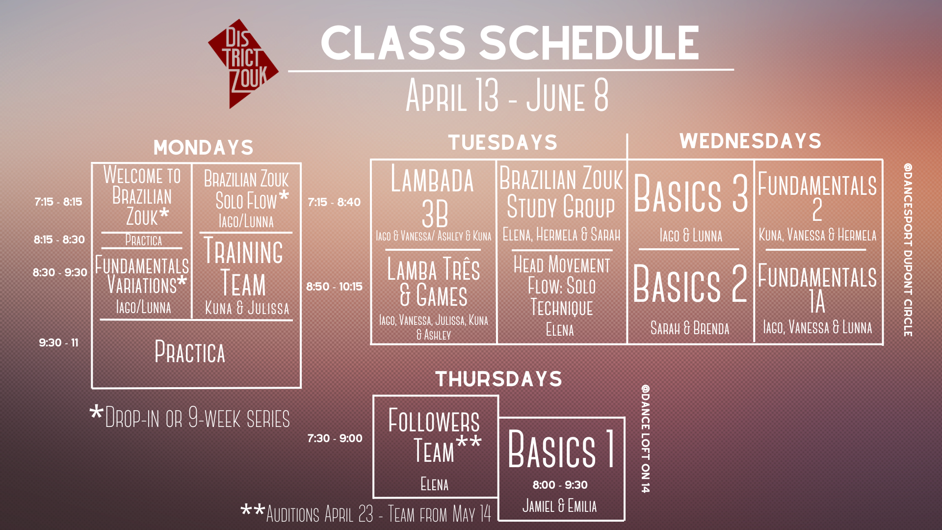 You can learn more about our curriculum and special classes below. For our Brazilian Zouk classes Fundamentals level and up and our currently offered lambada classes, we ask that you get instructor permission to confirm the level is a good fit. We will offer assessments on March 30, April 6 & 7.
