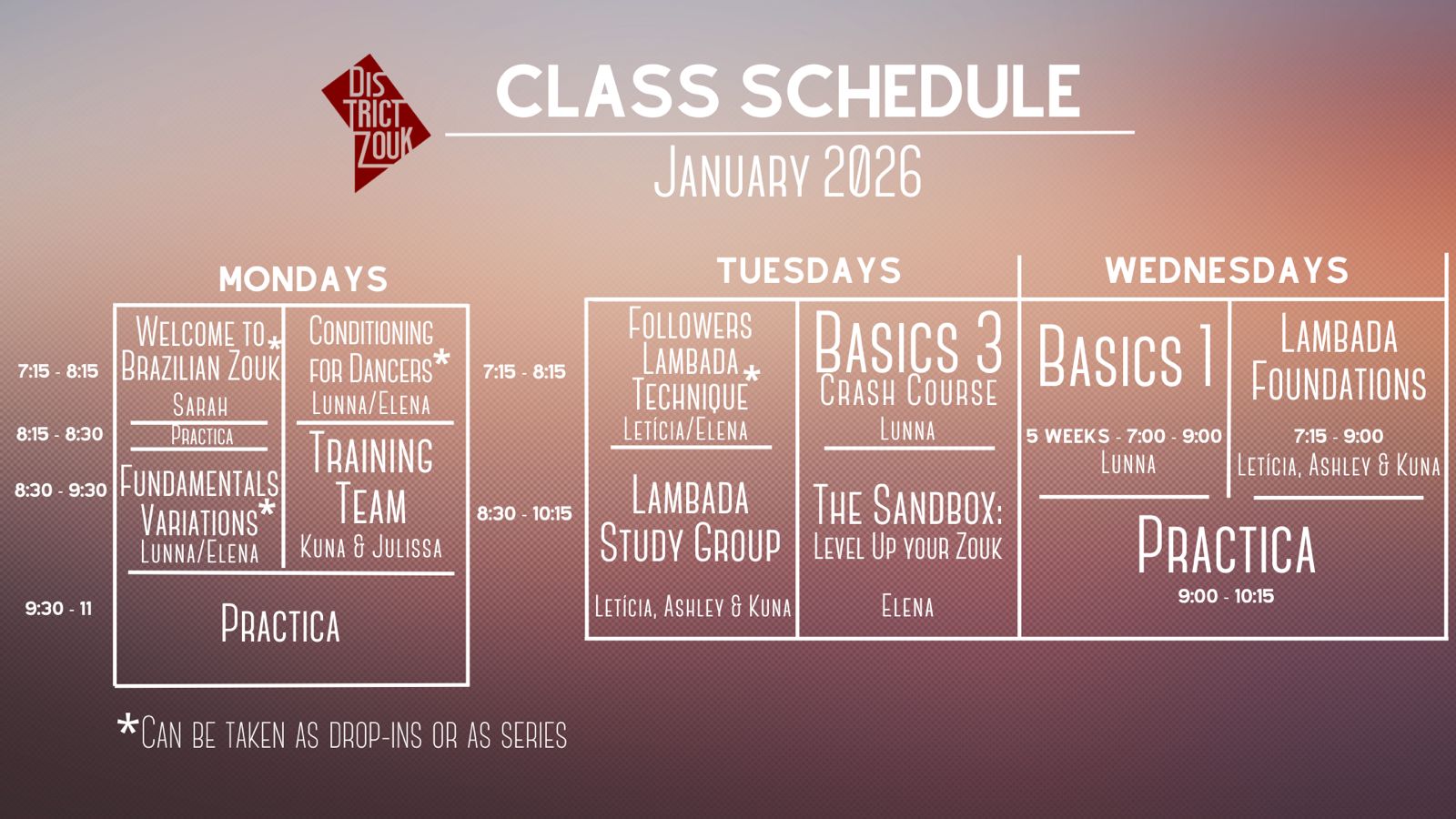 All January series classes include free admission to our Monday and Wednesday practicas.