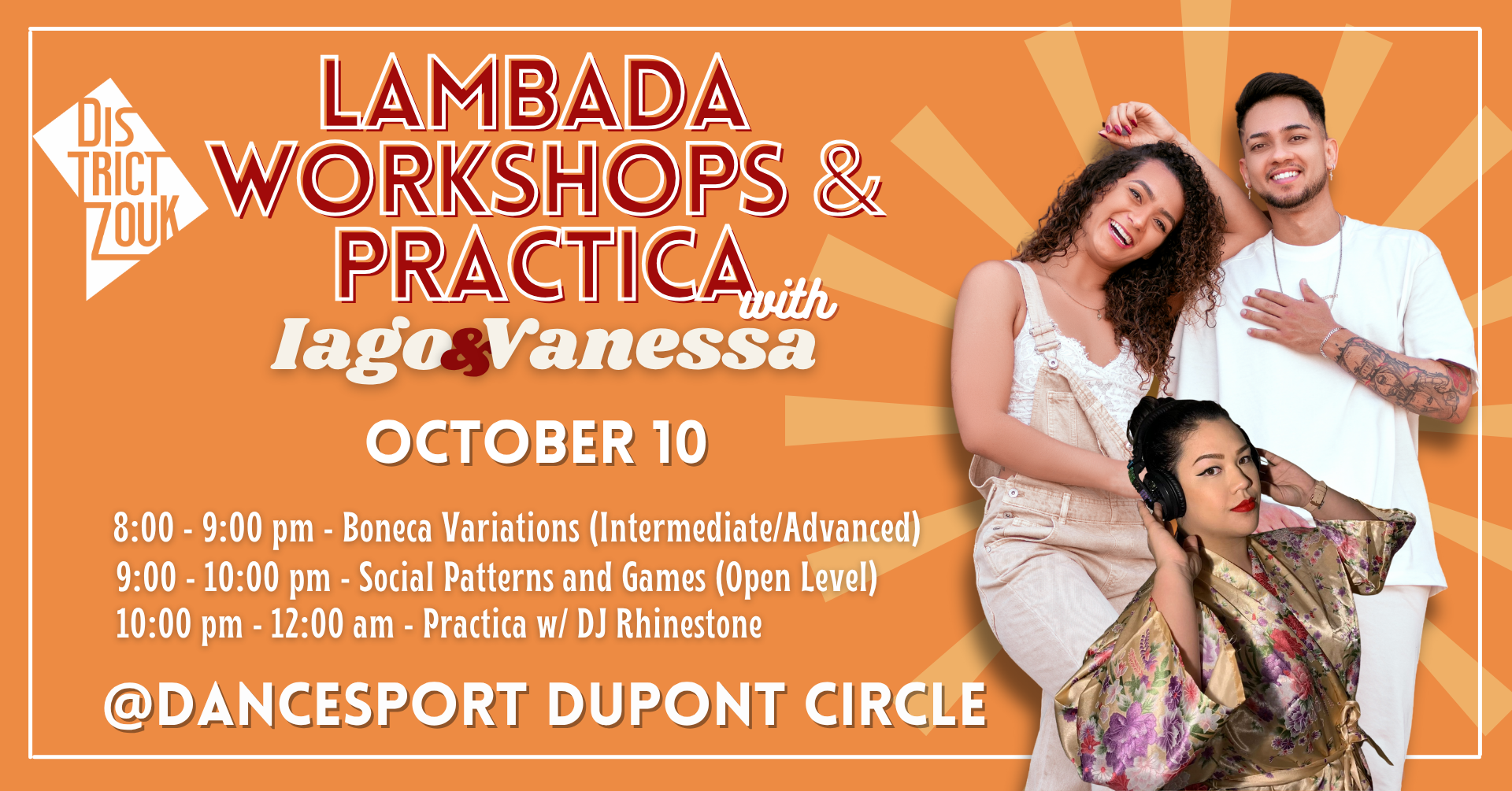 We’re bringing Leandro & Nayara back to DC for a full weekend of learning and social dancing! They’re known for their detailed ways of breaking down zouk technique and offering ways to improve your connection, musicality, and style. They’ll be joined by Iago & Vanessa, internationally renowned lambada and Brazilian zouk instructors who recently moved to DC.